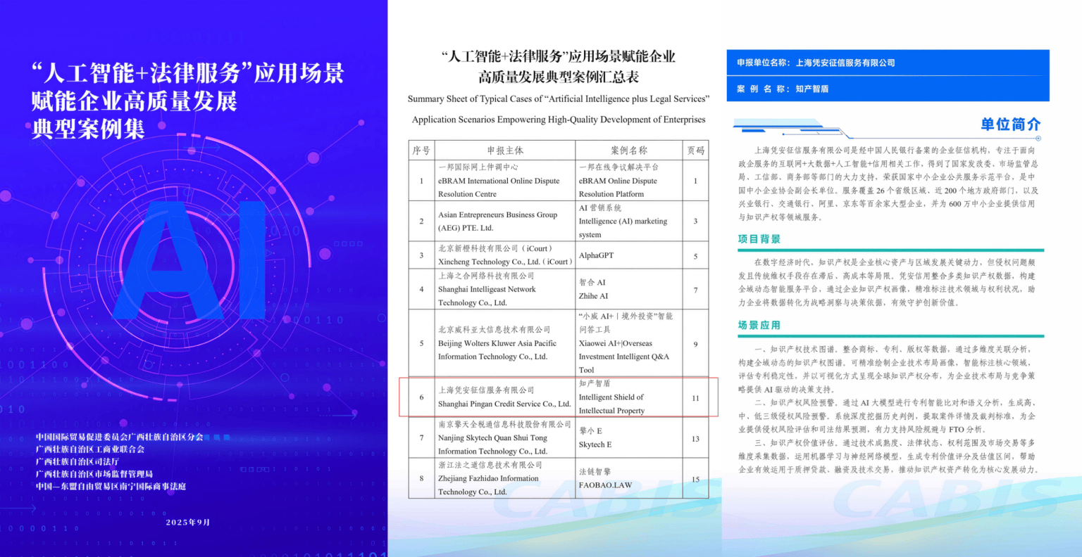 9月18日第22届中国-东盟博览会、中国-东盟商务与投资峰会平行论坛中国-东盟商事法律论坛在南宁成功举办。凭安征信作为优质政企服务商携知产服务平台知产智盾隆重亮相,作为知识产权全域动态智能服务平台“知产智盾”成功入选《“人工智能+法律服务”应用场景赋能企业高质量发展典型案例集》。同时凭安征信也是峰会上发布的广西知识产权数智化协同保护机制的知识产权风险“一键查”小程序技术支持企业。