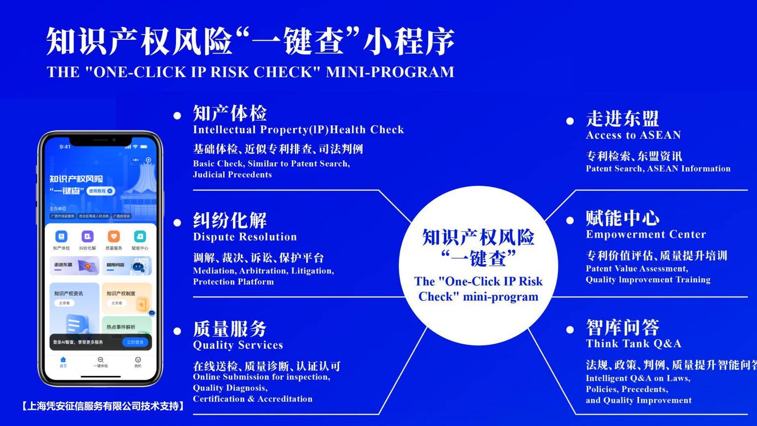 论坛上广西知识产权数智化协同保护机制盛大发布,凭安征信为其线上服务知识产权风险“一键查”小程序提供技术支持:在数据层面,凭安征信依托权威的企业数据资源,协助构建了覆盖专利、商标、版权等多类型知识产权的标准化数据库,实现跨部门、跨区域数据的实时对接与深度融合,确保用户通过小程序即可获取全面、准确的知识产权信息。在功能实现上,凭安征信运用智能算法与AI大模型以及整合监管部门实际服务场景,通过六大核心功能提供服务:知产体检、纠纷化解、质量服务、走进东盟、赋能中心,极大提升了知识产权保护的响应速度与精准度。凭安征信不仅保障了系统的高效稳定运行,更通过数据赋能实现了知识产权保护从“被动响应”到“主动防控”的转变,助力广西打造法治化、国际化营商环境,为中国—东盟区域创新合作提供坚实保障。