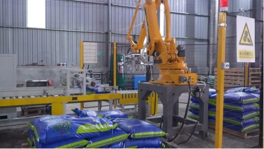 (图为:工厂使用机械手对产品进行堆垛)