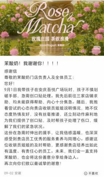 9月1日,在安庆吾悦广场,一位母亲发现孩子的手被划伤出血。情急之下,她向多家店铺求助创可贴未果,最终在茉酸奶门店得到收银员的及时