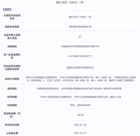近日,国家外汇管理局河南省分局对外公示一则行政处罚决定书,文号为:豫汇检罚〔2026〕1号,郑州银行股份有限公司(下称“郑州银行”)因外汇业务违规操作被处以罚没款项共计100.59万元,引发行业关注。