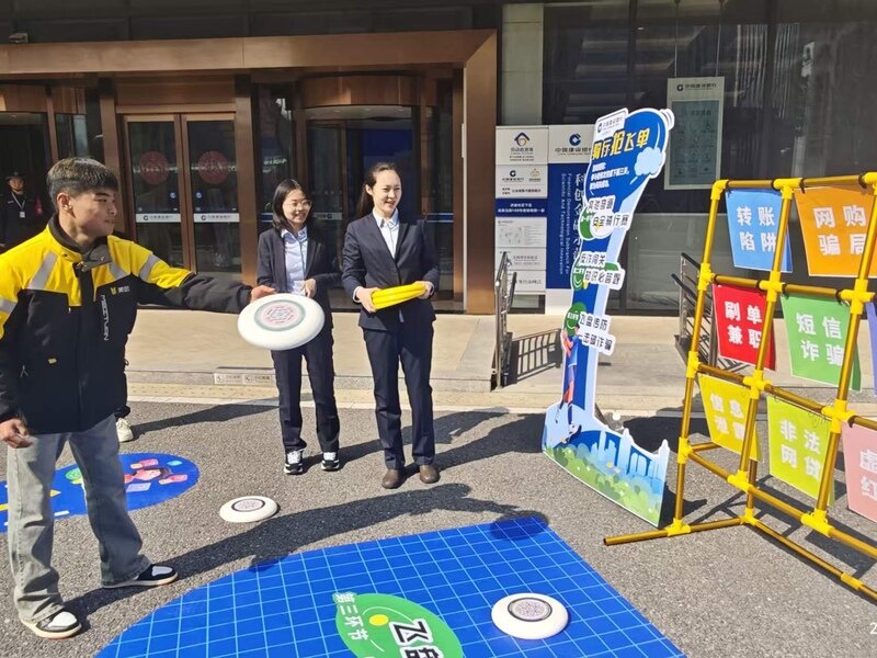 在外场活动区域设置了主题宣传入场门、特色拍照打卡墙、金融知识科普展板及车辆装饰区,营造出浓厚的宣教氛围。参与者走进活动入场门,在主题墙打卡留影后,纷纷将印有3·15金融教育宣传口号的小旗、贴纸等装饰到外卖车上,打造了一辆辆“消保宣传车”,在大街小巷形成了一道道流动的风景线。活动现场参与者沉浸式参与两款量身定制的互动游戏:“订单分拣-反诈甄别赛” 模拟快递包裹分拣场景,将快递理赔诈骗、虚假贷款、刷单返利、冒充平台客服等高频骗局融入游戏环节,参与者需在规定时间内将“非法陷阱”与“合法权益”精准分类,在趣味游戏中快速掌握反诈识别技巧。“骑行抢飞单” 游戏结合骑行、驾驶工作场景,以飞盘投掷、金融知识答题的形式,普及断卡行动、不出租出借银行卡等核心金融权益知识,让大家在轻松互动中牢记金融安全底线。