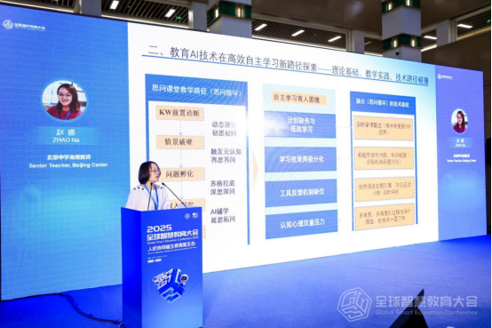 北京中学赵娜老师向与会嘉宾分享年度智慧教育优秀案例《中学生自学场景中的AI反馈与动态规划系统建设与应用》。