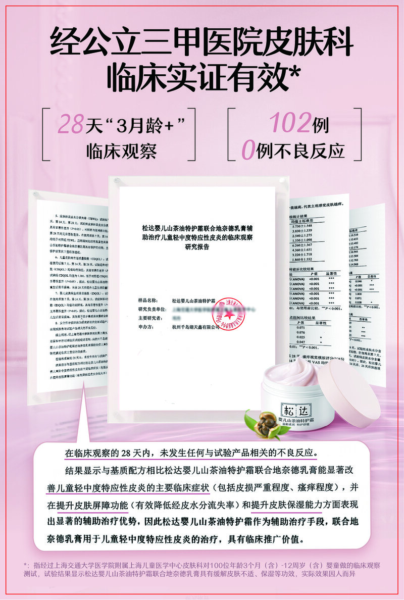 针对湿疹、干痒、泛红等婴幼儿高发肌肤问题,松达与权威三甲儿童医院合作,开展了专项临床观察试验。该试验采用随机、双盲、对照的严谨设计,将102名不同年龄的受试者分为儿童组与婴儿组,每组内均设置产品受试组与安慰剂对照组。在完成两周的基础激素治疗后,所有患儿进入为期28天的辅助护理阶段。临床结果显示,使用松达山茶油特护霜联合地奈德乳膏进行辅助护理的儿童中轻度皮炎,其皮损严重程度(红斑或者丘疹)瘙痒程度、提升皮肤屏障功能和提升皮肤保湿能力等方面 有显著辅助治疗的优势,且试验全程未发生一例不良反应。