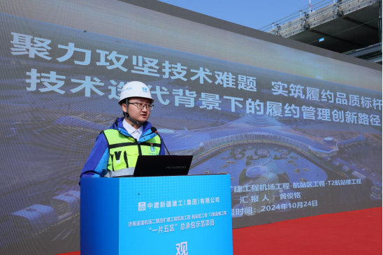 在项目总承包管理经验分享环节,济南遥墙机场二期项目项目总工黄俊铭详细介绍了“一片五区”总承包管理的具体做法与成效。项目通过精益建造、创新创效、安全绿色等多维度管理,不断提升项目品质与施工效率,为打造行业典范奠定了坚实基础。