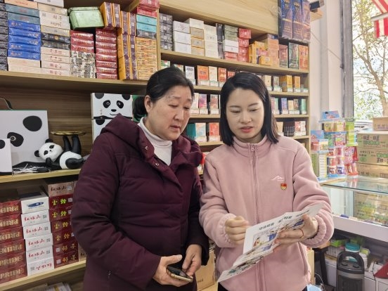 在富林镇汇福苑小区的一家便利店门口,店主刘大姐正在晒太阳,看到熟面孔的客户经理李欢欢过来,连忙起身招呼。