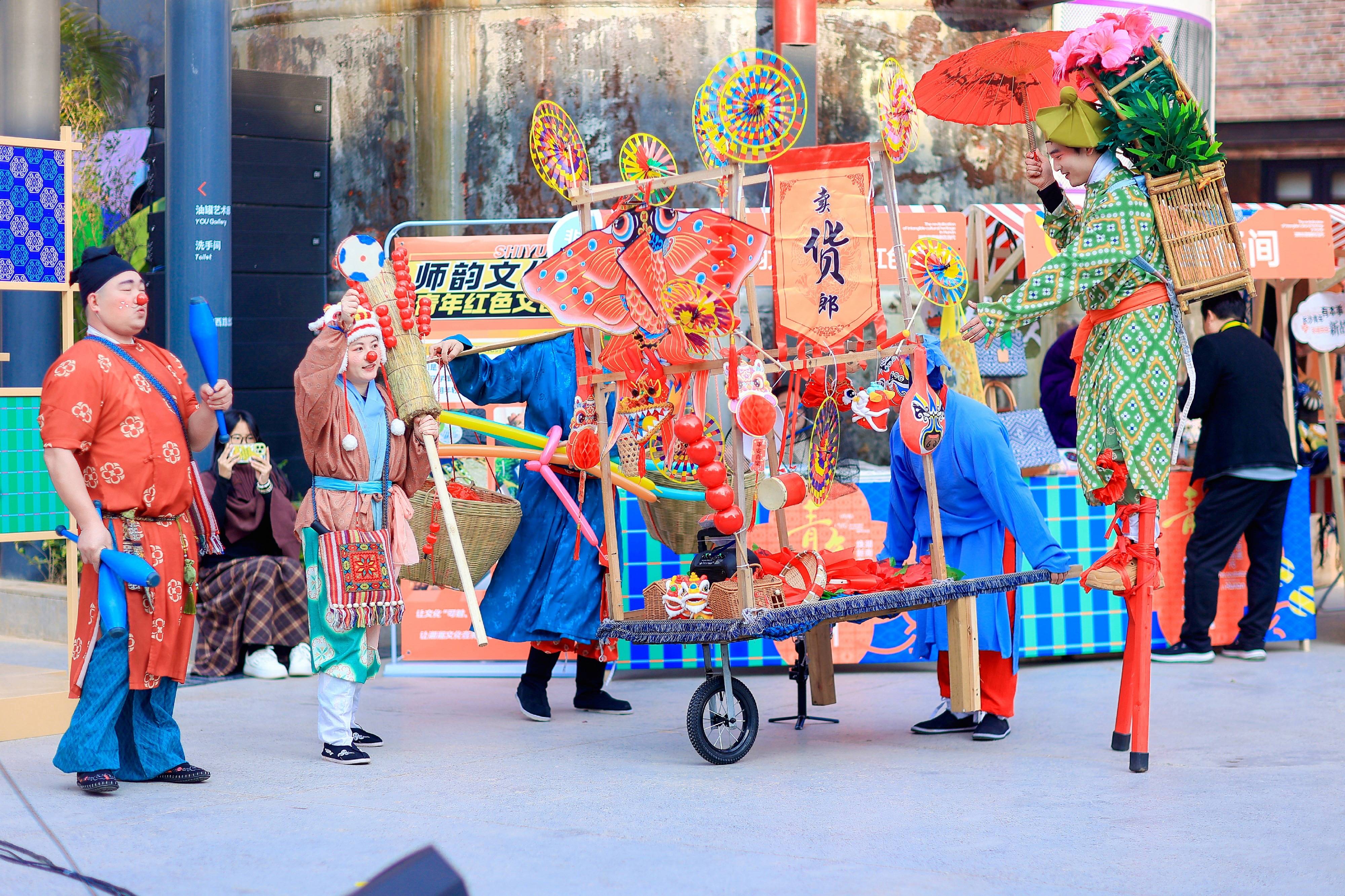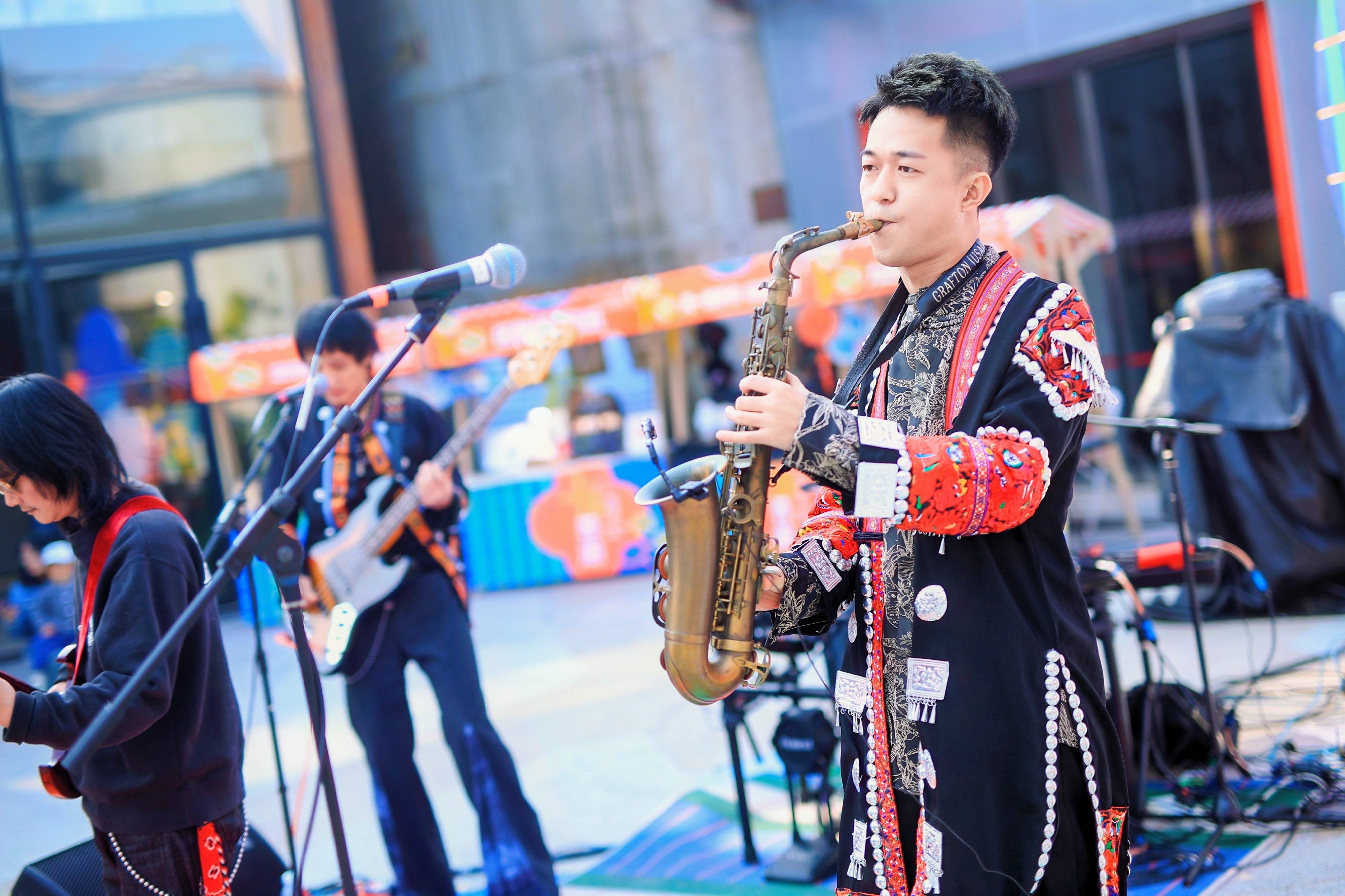 现场,古风NPC“卖花郎”巡游开市,身着传统服饰的“卖花郎”踩着高跷在现场穿梭,一秒拉满古韵氛围;非遗木偶戏剧表演则以灵动的杖头木偶戏演绎湖湘民俗故事;土家族民族摇滚乐队“撞克”带来呈现一场又燃又潮的视听盛宴。