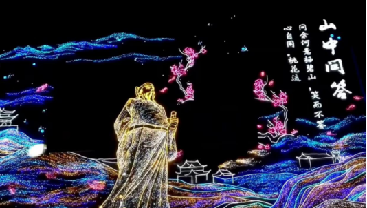 策划团队深入梳理李白在安陆留下的诗篇与足迹,撷取“桃花流水”“白云深处”“举杯邀月”“仗剑去国”等经典意象,通过前沿的4D投影映射、激光雕刻、智能联动控制等数字技术,将静态的诗句转化为动态的视觉叙事。
