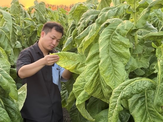 晨曦初露,微风拂过广袤的烟田,露珠在烟叶上闪烁,绿叶在晨光中轻轻摇曳,仿佛每一片都在迎接新生。肖向阳蹲在田埂边,指尖轻抚烟叶,